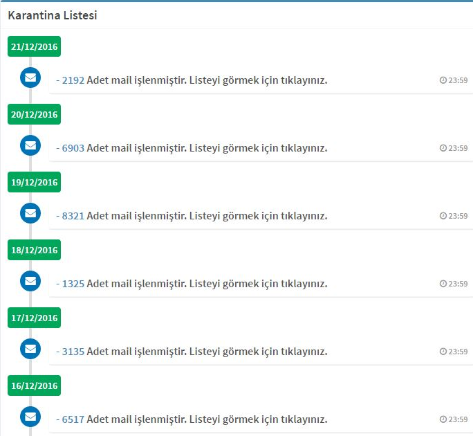 Resimde yer alan raporda bir haftalık süreç içerisinde karantinaya alınan spam içerikli mailler liste halinde tarih ve saat kayıtları ile birlikte haftalık olarak kayıtlı kullanıcı mailinize gönderilmektedir.