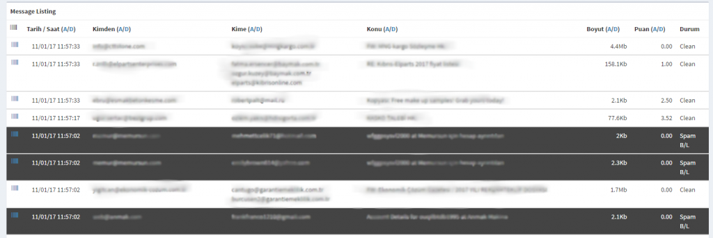 Resimde görülen rapor sayfamızda gelen ve giden mailler için spam,temiz,atla ve gönder gibi işlevler yapılmaktadır. Resimdeki sayfamızdan mailler ile ilgili el ile işlemleri yapabilirsiniz.