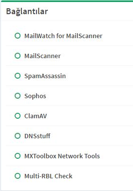 Antispamgw bağlantilar sekmesinde kullandığımız alt yapı çeşitlerini göstermektedir. AntispamGW bir çok etkili mail koruma yazılımının bir arada toplanarak bir bütün halinde denetim ve kontrol yaptığı bir yazılımdır. AntispamGW bünyesinde kendini dünyaca kanıtlamış iki adet antivirüs kullanmaktadır. ClamAV ve Sophos markaları ile tarama yapmak haricinde, Blacklist kontrol yapan siteler ilede iletişim halinde olması nedeni ile gelen mailde bu sitelerde daha önce kara liste yapılan kelime,başlık yada içerik varmı denetlemektedir.