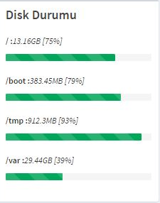 Disk durumu siz kulanıcılarımızın maillerinin diskte ne kadar yer kapladığınızı görmenizi sağlar. Antispam sunucumuzdaki disk,kök dizin ve geçiçi dizinlerin doluluk oranlarını bu ufak panel sayesinde takip edebilirsiniz.