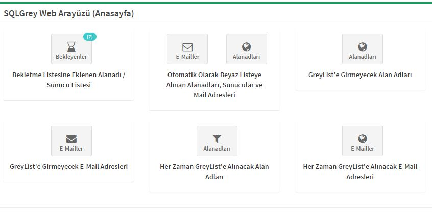 Greylist kısmında mail adresinize gelen ve şüpheli olarak geçen tüm mailler bekletilmektedir. Resimdeki ayar kısmından bu bekletilen mailleri görebilirsiniz. Yönetim menülerinden dilerseniz göndericileri alan adı veya mail adresi olarak beyaz listeye veya kara listeye rahatsız edici maillerden kurtulabilirsiniz.